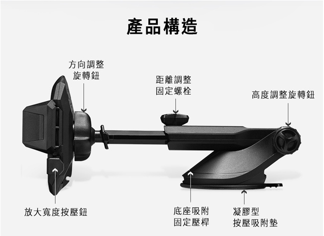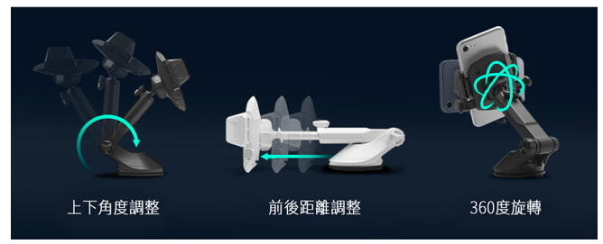 包括大角度的調整(吸盤與手機置放面板)、360度旋轉的置放手機面板、可延伸的手機支架,具有整線設計的面板,這些在大部分的手機支架都不易看到。