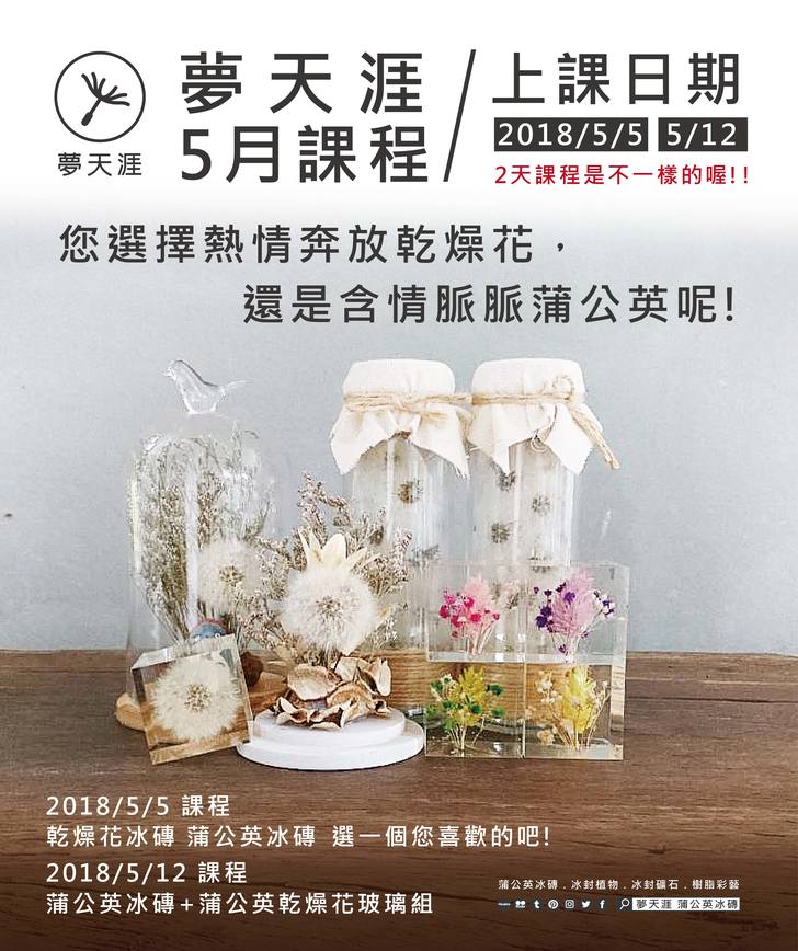 ◢ 教學費用 : 5/12號 2300/人(包含蒲公英冰磚+蒲公英乾燥花玻璃組)(報名截止日為4/30,因玻璃組乾燥花須提前調貨)