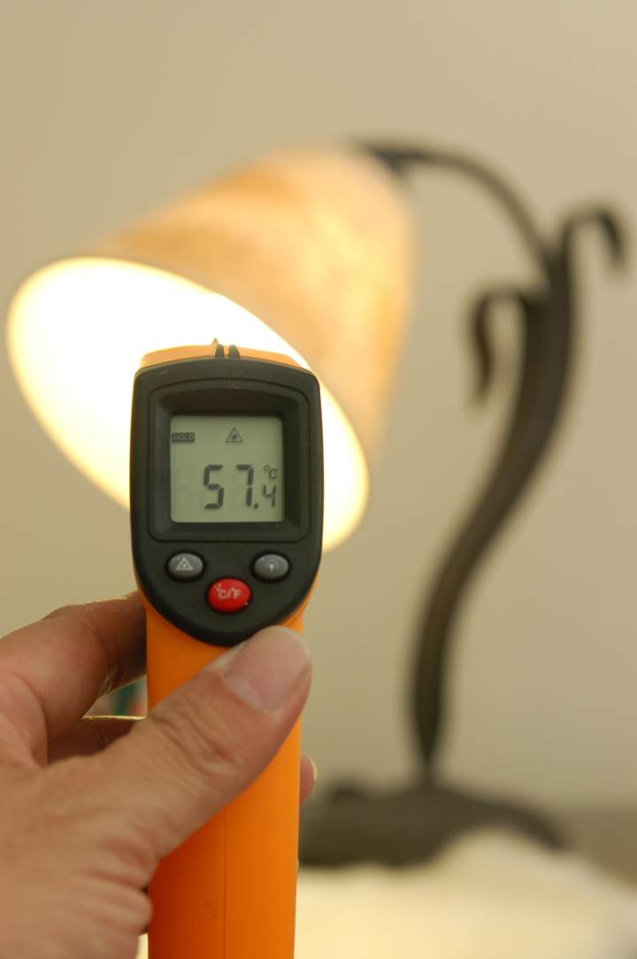 ▲ 透過測溫表照射電子式省電燈泡所獲得的溫度數據為57.4度,由此看來造成室內溫度過高的元兇是誰,應該大致都知道了吧!因為它也是導致大家狂開冷氣,造成用電高漲的原因之一。