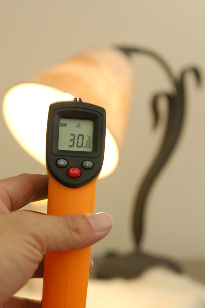 ▲ 同樣透過測溫表照射電子式省電燈泡所獲得的溫度數據只有30.8度,所以使用LED燈泡,可以替室內溫度降低好幾度;尤其小朋友近距離接觸檯燈,得不到100分不能怪他,因為就是用錯燈泡!