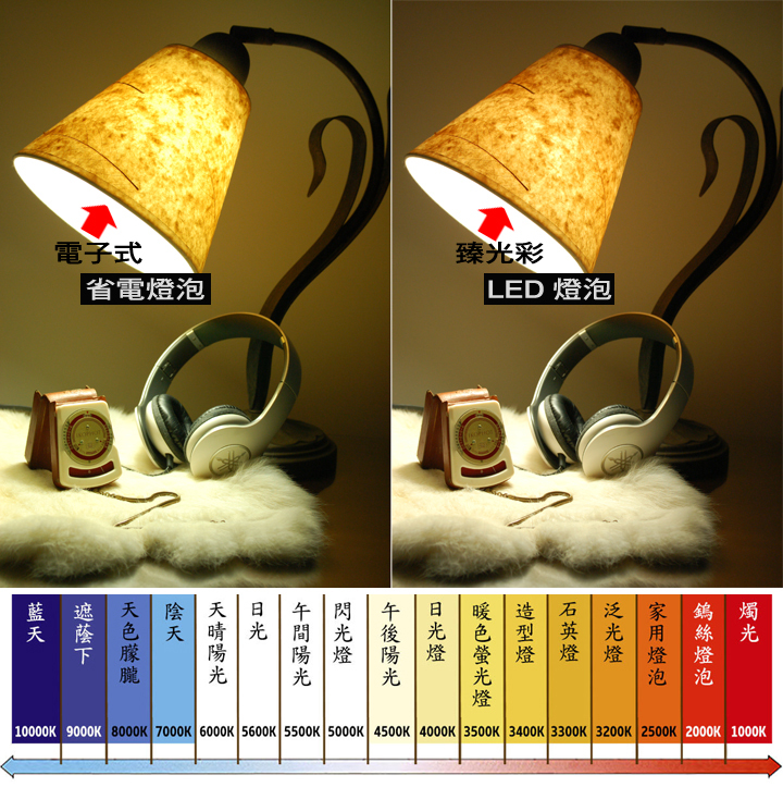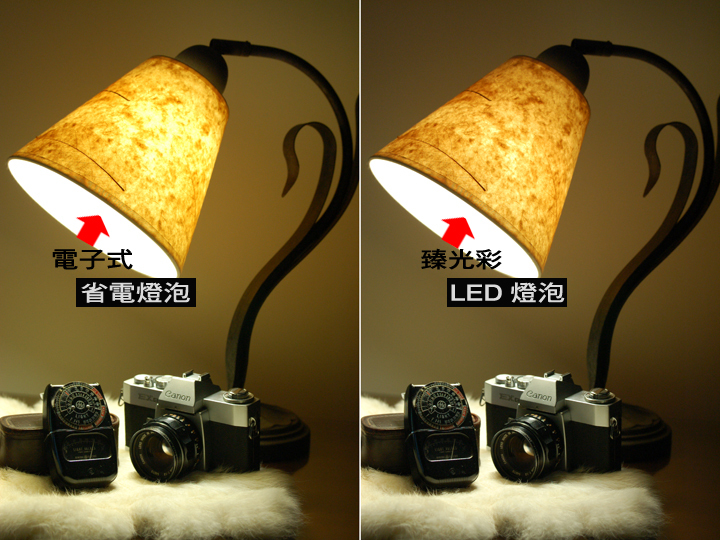 ▲ 使用相同4000K的電子式省電燈泡來與LED燈泡作對照,透過同樣的檯燈與角度來看,我們可以明顯看到右圖LED燈泡所呈現接近太陽光的全光譜,高達95以上演色性,讓所見物體如同原色。