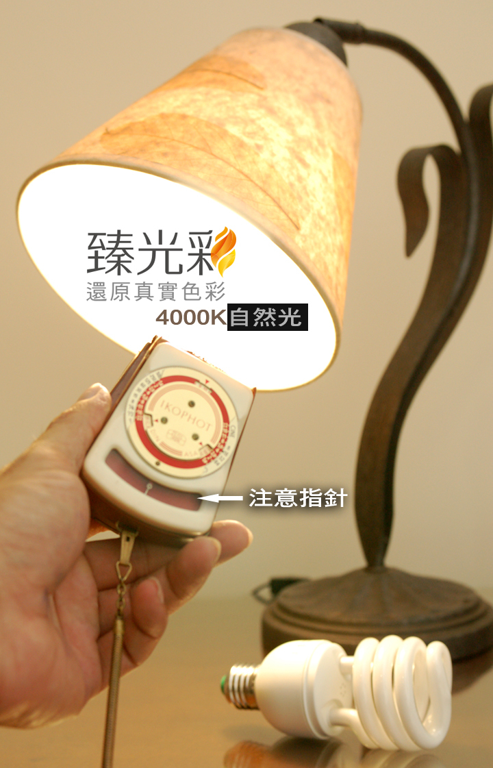 ▲ 目前桌面擺了四顆4000K/2700K的LED燈泡,但實際環境照明是使用4000K*2顆、6000K*2顆電子式省電燈泡(消耗功率23W*4=96W),請注意目前測光表指針所指的位置,往左代表樂亮。