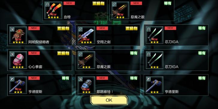 除了爽快的揮動武器打鬥外,這遊戲也有武器、角色收集等轉蛋活動,角色一抽25鑽、武器15鑽,滿10抽送一次;目前玩此遊戲還沉浸在打擊的樂趣中,並不會專想收集武器、角色,各10+1抽就有以下結果,因此偶爾抽抽還覺得蠻不錯的;跟著故事打關卡探索劇情,也還不錯,到最後應該可瞭解跟武器說再見的緣由吧!看看能玩到哪囉!