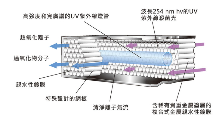▲主動淨化即採用UVC與光觸媒二種技術,UVC具有殺菌效果,而光觸媒可釋放淨化分子,進而降低或分解細菌、病毒。而釋放之負離子可集結PM2.5等懸浮微粒,使之變大,而不會讓人吸入無法排出之微粒。