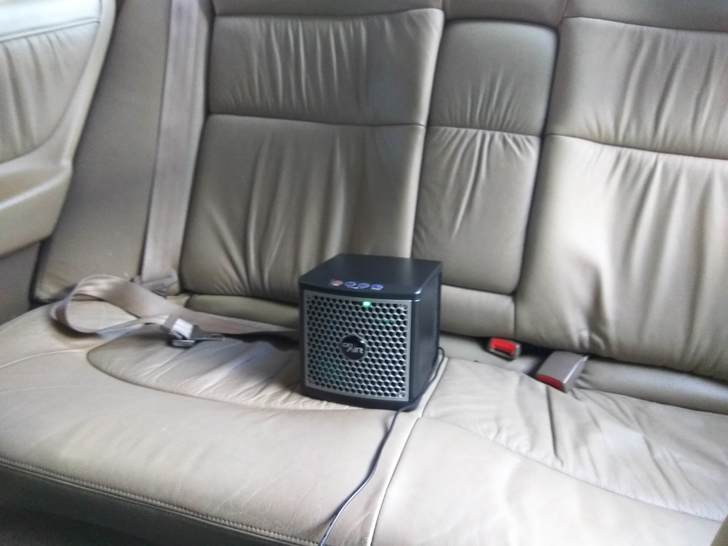 ▲Dr.Air Q Cube INT-25選配的車用供電器線長較短,僅能放置後座,理想的位置應置在後方玻璃旁。但依然有空氣淨化效果,畢竟車內承受高溫與外邊的排放癈氣,更需要淨化一下。車內有人時,建議還是綠燈消毒模式為佳。