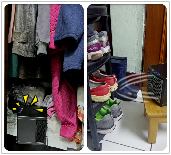 【▼】另外像衣櫃以及鞋櫃更是Dr.Air空氣醫生的拿手好戲,只要將風速開最大並啟動進階模式,不到一會兒,鞋子的鹹魚味消失了,衣櫃內的霉味也變成沒味了,不用再放什麼樟腦丸之類,一機統統搞定!