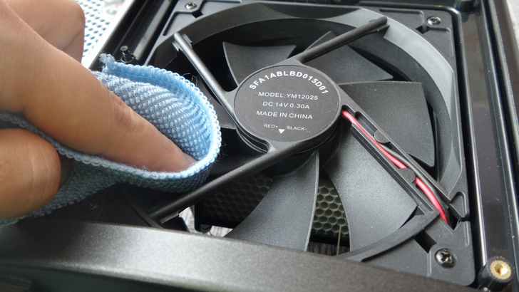 【▼】最後是風扇與外蓋部分,由於12x12cm算是不小的風扇,所以要有耐心的一片一片擦拭,這邊就可以用濕抹布來處理,清潔完後風力感覺更強更猛了~
