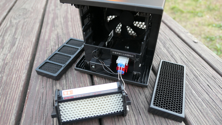由於物聯網是未來趨勢,本以為空氣醫生與手機放在一起是可以用手機作遠端監控,但實際上只是一個比例尺的概念,是略為可惜了些。還好電源部分還提供了汽車點火頭的擴充,不過沒設計USB供電,猜想應該是臭氧需高壓放電來產生,USB的5V應該不夠力來推動。而若你常處於油煙、多人抽菸的環境時,還可以加裝活性碳濾棉來攔截油汙、焦油等附著物進入設備中,要注意的是這兩者擴充物品都是要另外選購的。