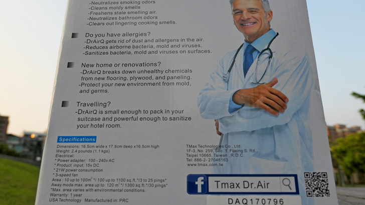 【▼】包裝側面的這位老兄,想必這位應該就是空氣醫生了吧!在他身旁有Dr.Air的產品規格與QRCode,要follow他的網友們可直接在臉書粉絲團搜尋 "Tmax Dr.Air"