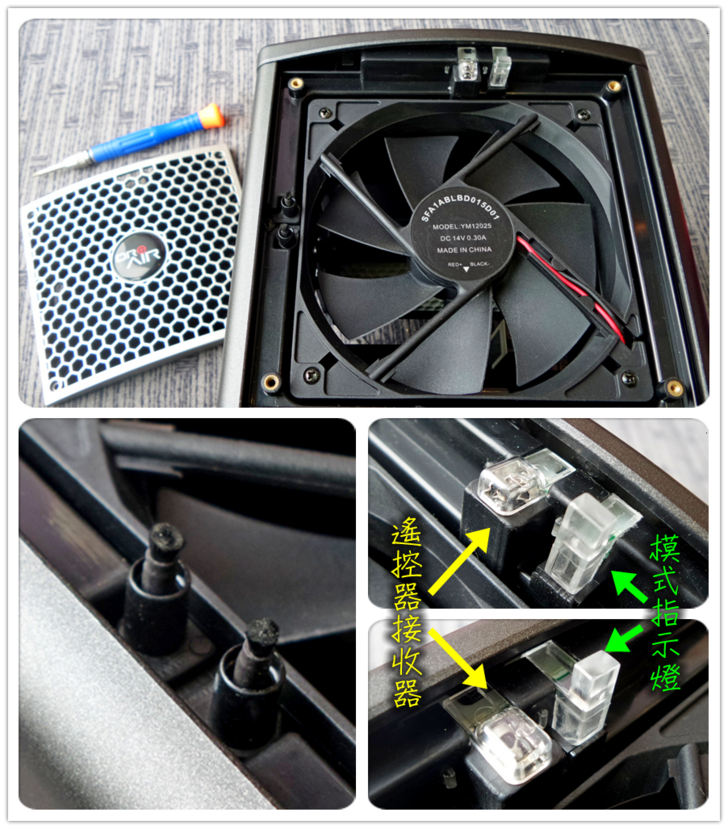 【▼】接著可以看見取下網蓋的內部狀態,12x12cm的大風扇型號是YM12025,額定電源是DC=14V@0.3A,在風扇上方有兩個白色透明的鏡面裝置,左邊是遙控器接收器,右邊則是模式指示燈,皆可用衛生紙稍微擦拭乾淨,以保持光源明亮及接收順暢。