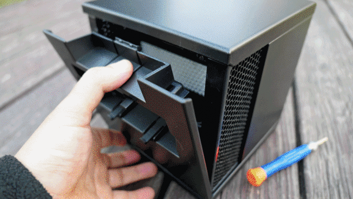 【▼】而在Dr.Air空氣醫生的機身後方貼有每台獨一無二的產品序號,另外在清潔保養上我們可以發現後蓋採下壓開闔式的面板設計,不需工具,相當的輕鬆便利。