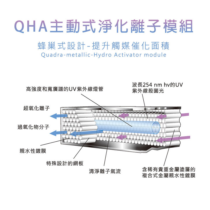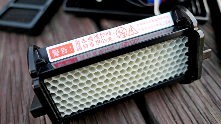 【▼】來看看Dr.Air空氣醫生中QHA主動式淨化離子模組的內部結構吧!首先蜂巢式的設計能提升觸媒催化面積,而波長254nm的紫外線燈管、金屬鍍膜以及網板都是讓離子能釋放出去的關鍵因子。若可以將光觸媒若能設計成呼吸燈效果,想必在淨化時一定更有情調~