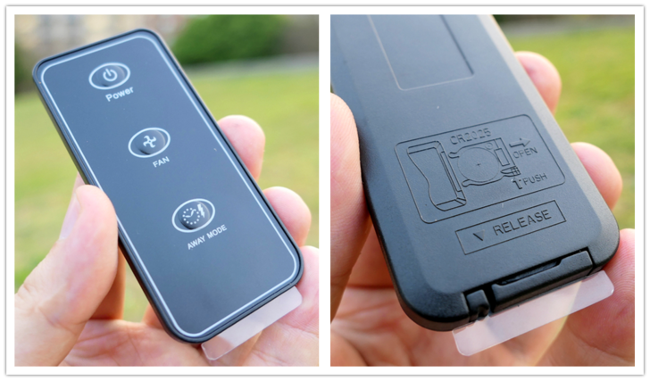【▼】遙控器輕薄短小,大概就一根食指的長度,正面有三個功能實體按鍵,由上而下分別為電源開啟、風扇強度與模式選擇,使用的電池為CR2025鋰電池,記得使用前要將塑膠擋片給拔除唷~