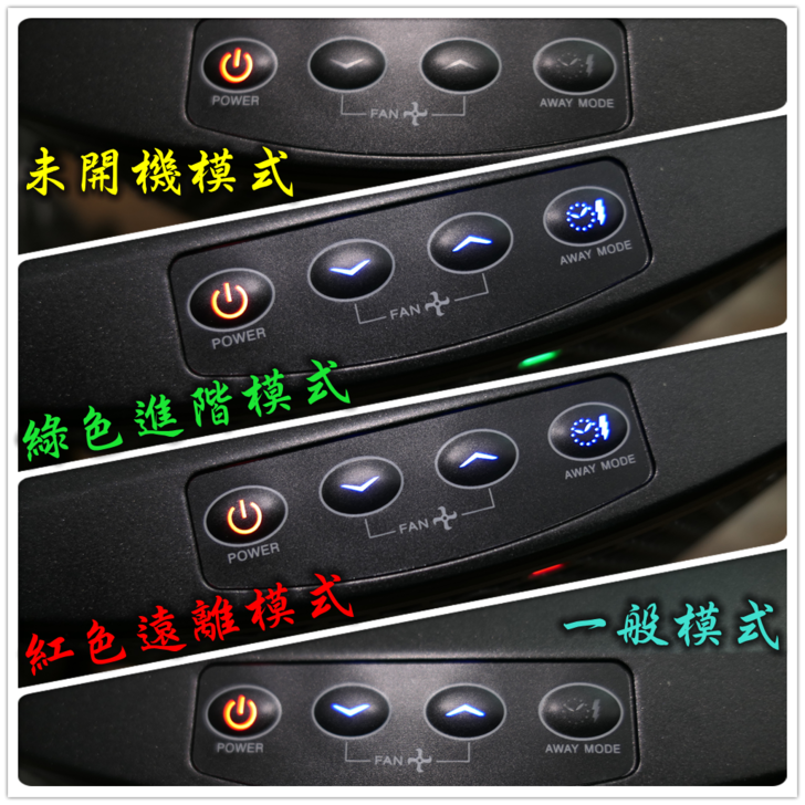 【▼】這次體驗的Dr.Air空氣醫生似乎有點小改版,之前在展場看到的前視網格似乎是方形的設計,這次改為六角蜂巢狀的設計,看起來更為美觀,而在機身頂部有四顆實體按鍵,功能是與遙控器上一致的,差異就在於三段風力的控制,遙控器上是循環式的切換,而機身上可直接增強或減弱風力,而且機身上的實體按鍵還會發出LED色澤(電源紅光、其餘藍光),在夜晚操控時也不會按錯。