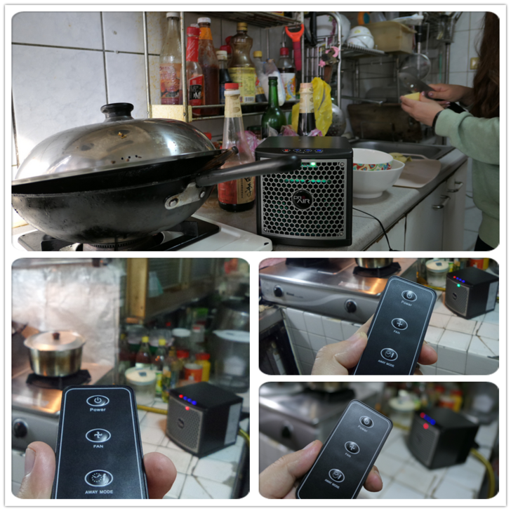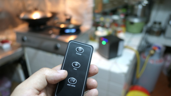 【▼】對付油煙,小編的心得是利用Dr.Air空氣醫生作兩段式過濾,第一段是把活性碳濾棉給貼上,開啟進階模式過濾個15分鐘,之後再把活性碳濾棉拿下並切換到一般模式再濾個15分鐘。若油煙太重不方便進入的話,還可拿遙控器來遠端控制,真的超級貼心的啦~
