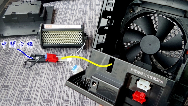 【▼】由於超氧淨化片與主動殺菌離子模組都是要吃電的,所以在清潔這兩個項目時,就必須先移除電力連接器,紅色電力連接器是超氧淨化片專用,而白色電力連接器則屬於主動殺菌離子模組,電力連接器拆下的方式就是左右按壓後向外拔起,而且有防呆裝置,所以不用太擔心。