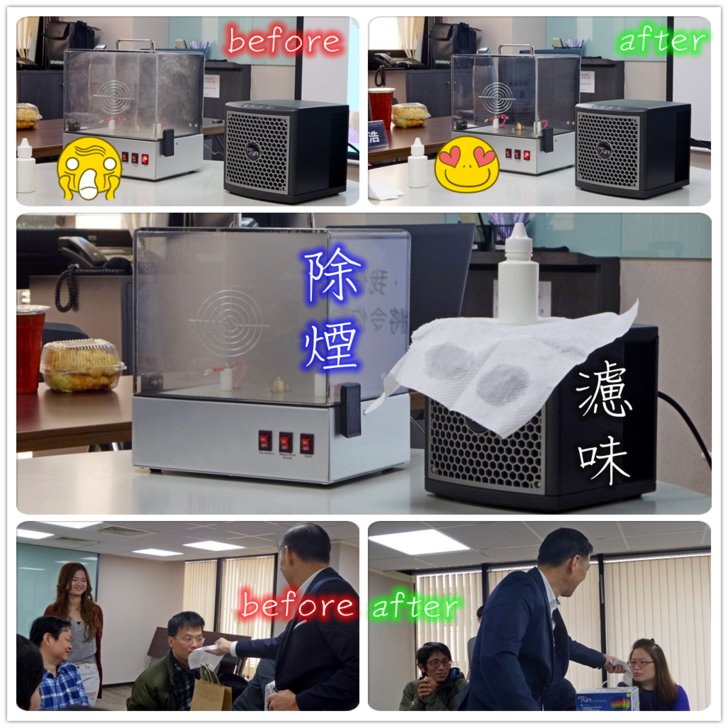 【▼】Dr.Air空氣醫生五機一體可不是喊假的,還記得體驗日當天,原廠展示了除煙與濾味的實驗,真的是有夠誇張,本來密閉的容器內,經過Dr.Air空氣醫生的除煙效果,變得乾乾淨淨,讓人不可置信,而沾有阿摩尼亞的衛生紙也是一樣,使用前刺鼻味薰得要命,使用後竟然一點味道也沒有,傑克,這真是太神奇了!