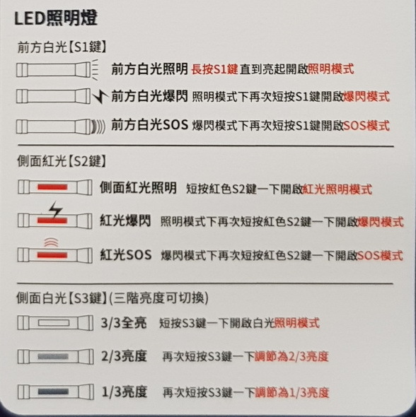 聚光最遠射程80~100M聚光可調整三種模式,照明/爆閃/SOS