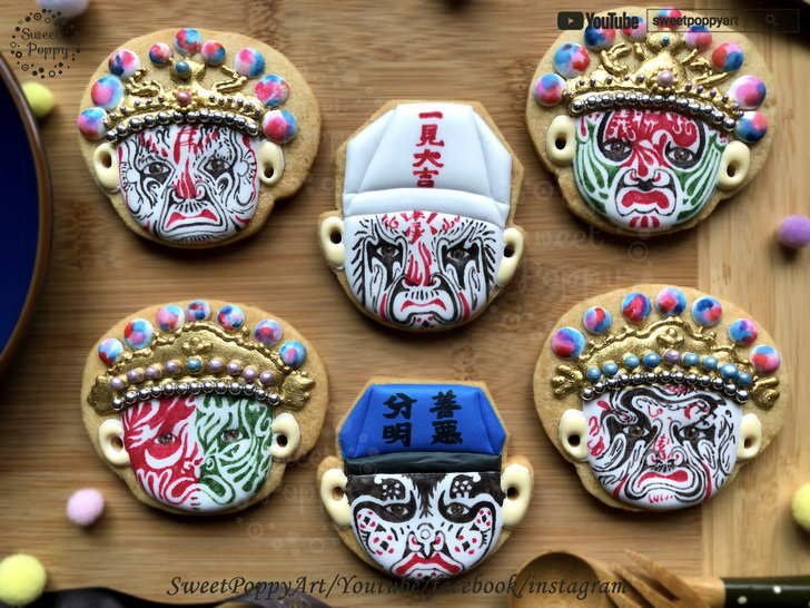 因為是第一次製作臉譜作品,低估了製作時間,不計算設計、烘烤、烘糖霜,光是Poppy半夜幫餅乾神將從開臉(畫臉譜),完成時已天亮