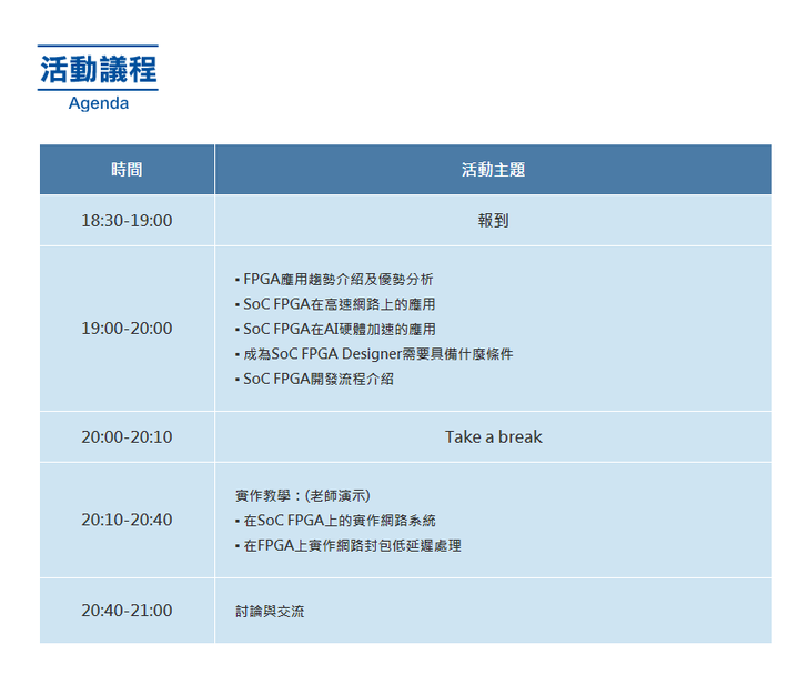 本研討會將介紹FPGA優勢、FPGA在高速網路、AI的應用、踏入SoC FPGA晶片設計領域需要哪些知識,以及如何利用SoC FPGA架構所設計的嵌入式平台,在價格和性能上達到最優,讓產品能夠及時上市,快速搶占市場。