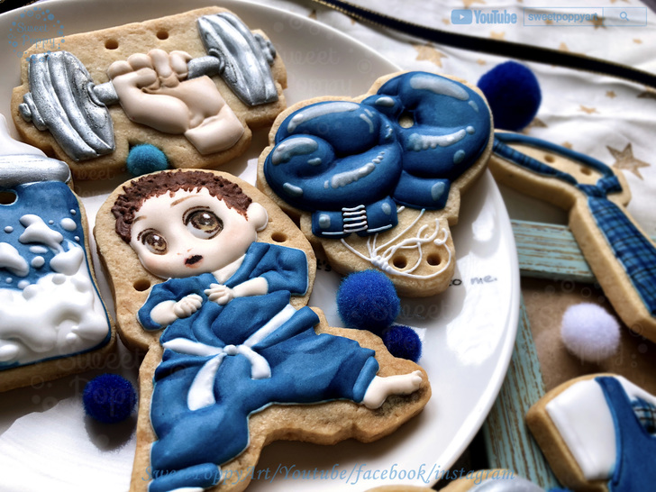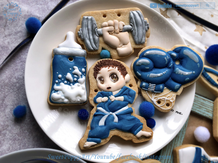 小男孩餅乾,穿的是巴西柔術道袍,是愛健身的爸爸,熱衷的運動。為了成為男子漢,當然也要有啞鈴,拳擊手套來鍛練我們的軟A弟弟啦