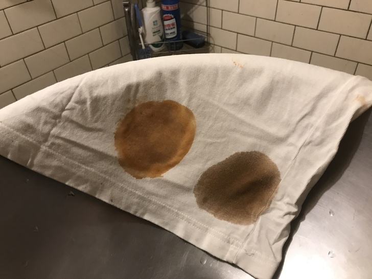 使用前污漬左側—甜辣醬 右側-醬油,醬油反而能較有效清除,反而甜辣醬卻留下了印記。