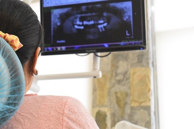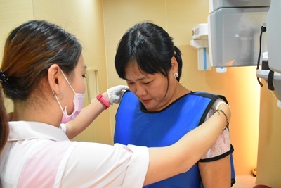 咬模前護士先帶著我們來到3D電腦斷層掃描室先照口腔X光,拍完X光片後一坐上診台就可以看到媽媽口腔裡面大大小小細節,每一顆牙齒一覽無遺,朱裕華醫師替媽媽做複診前透過X光片看到媽媽好幾顆做過根管治療的臼齒,稍微說明一下媽媽牙齒植體現在復原狀況後才開始進行咬模。