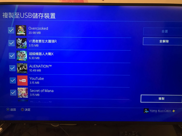 同樣按下手把上的OPTIONS鍵來複選要複製的存檔,最後按下「複製」,這樣就備份回去囉!