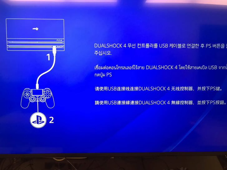 等到安裝完,就是回到剛買PS4第一次開機時的畫面,一樣顯示先以USB連接線接手把,然後按下PS按鈕做連接使用