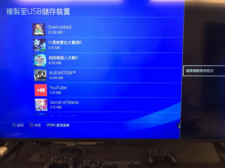 這時會看到所有的遊戲存檔,按下PS4手把上的OPTIONS鍵,可就會出現「選擇複數應用程式」的選項