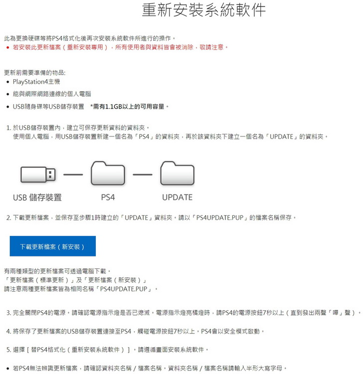 接著我們要重建PS4系統,先到官網下載檔案,大約1G左右,因為是重新安裝所以是下載整個完整的軟件,網址:https://asia.playstation.com/cht-tw/ps4/system-update