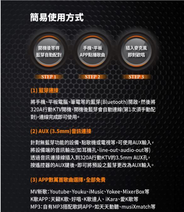 320A plus配備無線藍芽接收,一開機即自動連線,使用簡易方便。主機同時提供AUX音訊輸入,可連接電視、伴唱機、及任何設備的耳機或音訊輸出。