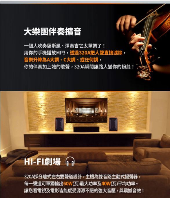 320A plus具備最專業的KTV伴唱系統!歌唱的音效控制,全部透過遙控器一指達成,包含音樂與麥克風獨立音量調整,伴唱與原唱聲道切換,全音域(+12至-12)升降Key動態調整,還有 8種預設殘響迴音音場可以選擇,讓您歌唱猶如大明星!