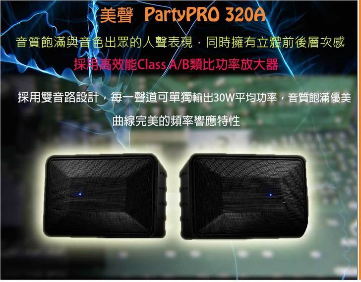 320A plus包含一對雙聲道主動式揚聲器,採用雙音路設計,每一聲道可單獨輸出30W RMS平均功率,音質飽滿優美,令您驚豔!