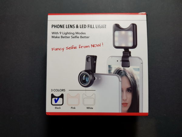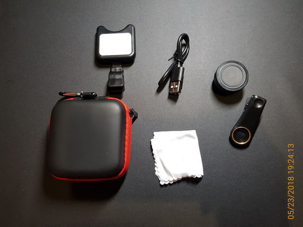 保護盒內的產品: LED喵喵造型補光燈+0.36x廣角+15x微距鏡頭三合一套裝,鏡頭擦拭布,充電線,廣角鏡頭夾