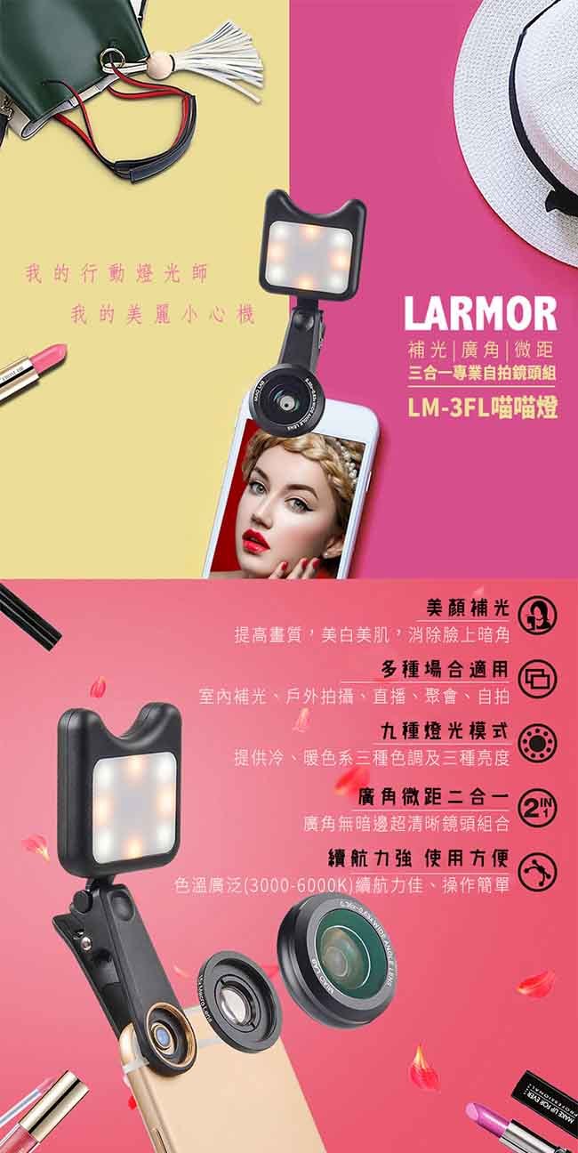現在, 網美或是愛自拍的人不用擔心這些問題了,必備的自拍神器來了..."Larmor LM-3FL喵喵自拍專業補光燈+手機廣角鏡頭套裝組"一次幫你解決所有問題,讓你自拍美到不行,讓你直播有高人氣。