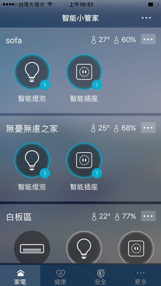 其實智能家電可使用範圍還真的不少,在現場時還可以透過智能小管家的設定控制活動現場的空調—這個我真的很喜歡啊,尤其是這種動不動就像火烤一樣的氣溫,實在很需要能夠在下班回到家之前,就能先把冷氣開起來讓屋子涼,可惜目前家中的冷氣機種是舊型的,並不支援(已哭),不過其它帶回來試的項目,還是十分有趣的。
