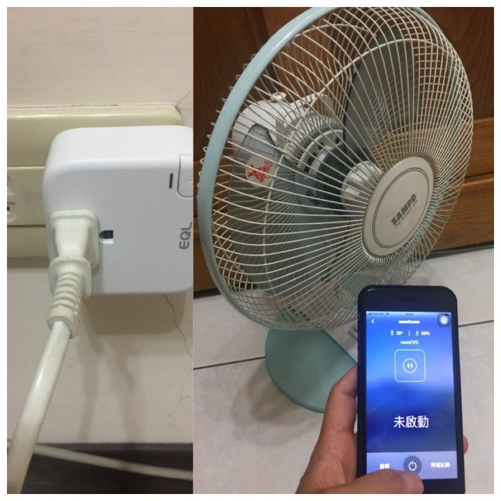 再來是EQL智能插座的部份,很快的便設定好APP,將它接上了電風扇的插頭後,手機的APP程式裡就可以看見控制風扇的狀態,電風扇靜止時,螢幕的介面上也看到了未被啟動的狀態。