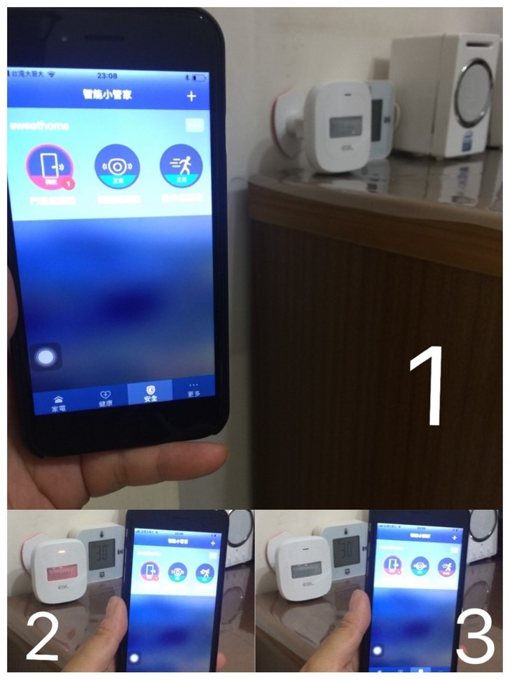 作為安全設備的第二環—EQL動作感應器,它的感應範圍算是頗大,配合EQL門窗感測器,放著接近門或窗甚或兩者之中間的位置,一旦有物體靠近(不一定是人),感應就會偵測到而亮紅燈,這時APP也會顯示出整個狀況。
