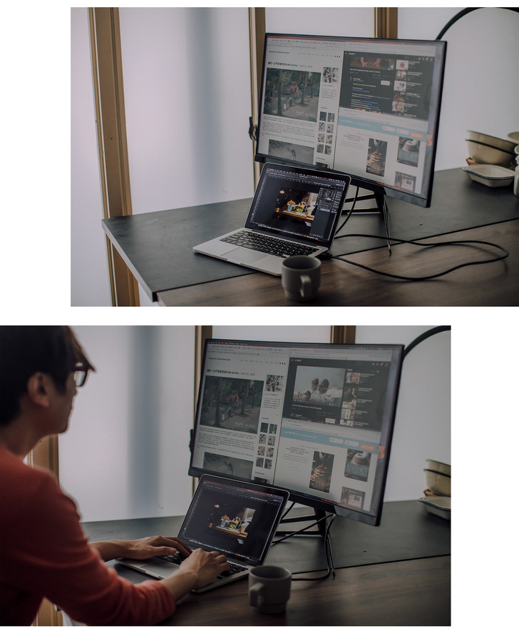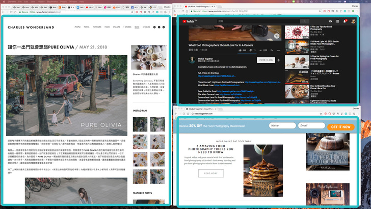 可以看到畫面中Macbook Pro開Photoshop使用,曲面螢幕我通常會開3-4個瀏覽器!