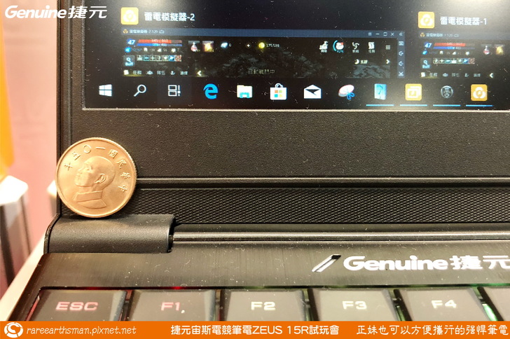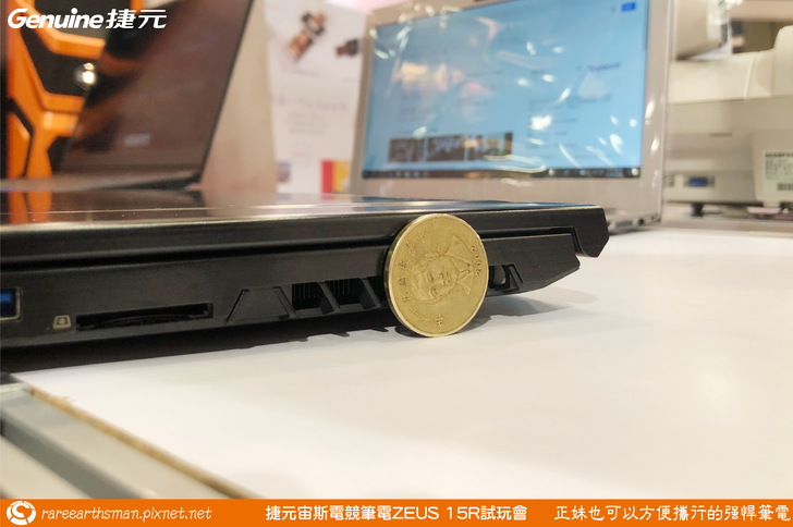 ▲這台筆電的設計一樣是採用前薄後厚的模式,因為官網上並沒有標示長寬高的尺寸規格,我又沒帶量測治具到現場,僅使用一枚50元硬幣來做厚度的參考比較,厚度差不多就是一枚50元硬幣的直徑,機深厚度不含腳墊約23mm。