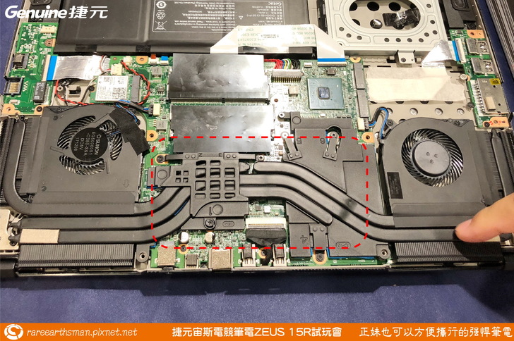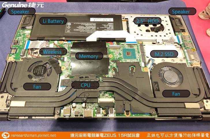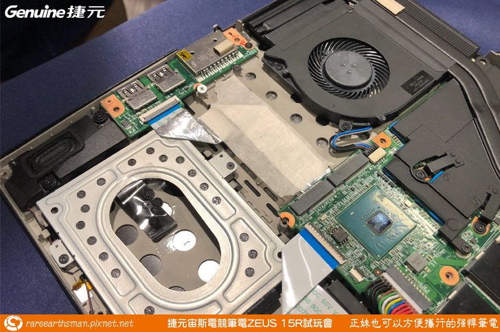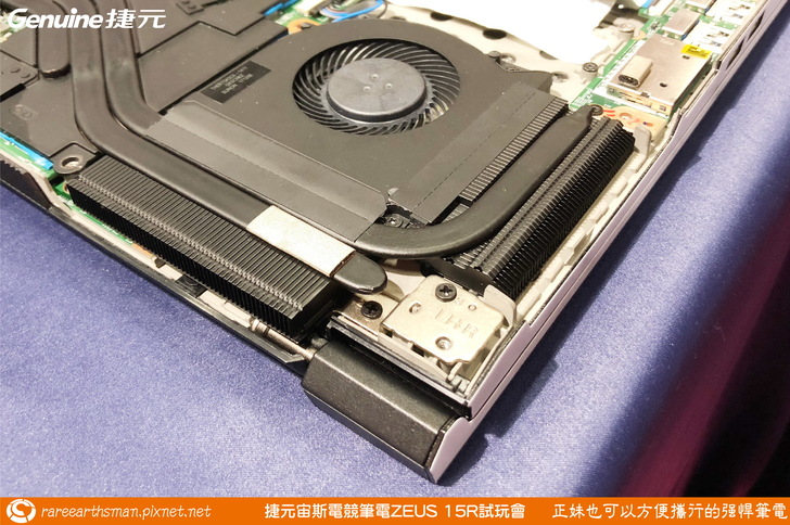 ▲因為展場展示的只有D面拆開的展示,無法看到更為深層的配置,單從圖片中只可初略的了解,靠近筆電後端的是主散熱區域,包括左右兩顆風扇以及連到中央的散熱導管,圖片右側的是儲存設備,包括2.5"的硬碟支架與M.2的插槽,左邊中間是無線網卡的地方,左前方大面積的是鋰電池,前方兩端的是喇叭組。