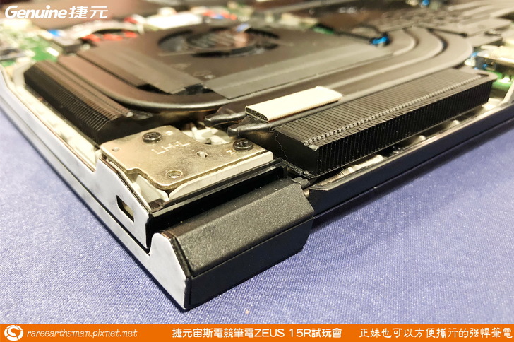 ▲其實要在筆電上做到桌機的效能,更何況是電競等級的高需求,除了各項零配件都需要瘦身之外,最大的問題就是熱的問題,在玩遊戲時特效全開,這時候是CPU全速運算的時候,同時也會產生熱,如果機殼內部產生的熱無法順利排出的話,甚至ㄧ直累積在機殼內,CPU就會開始降速,運算效能就會減損,也容易造成卡頓或破圖,所以導熱及散熱的問題是非常正要的。