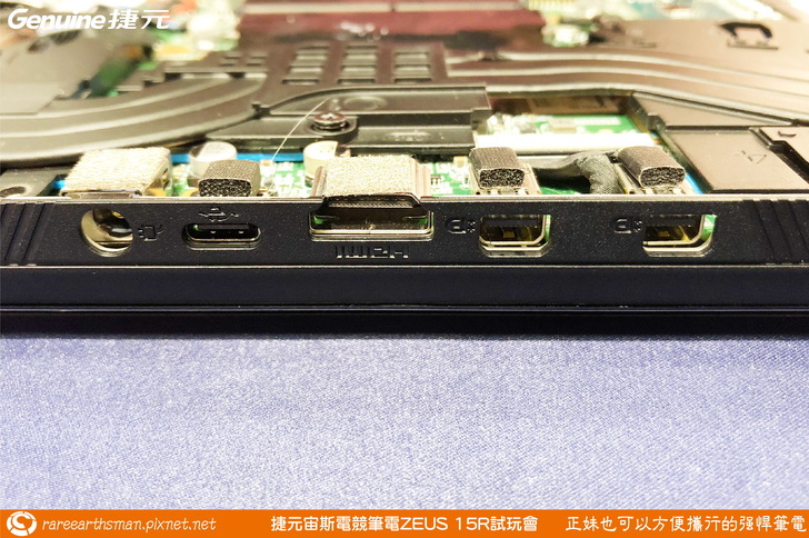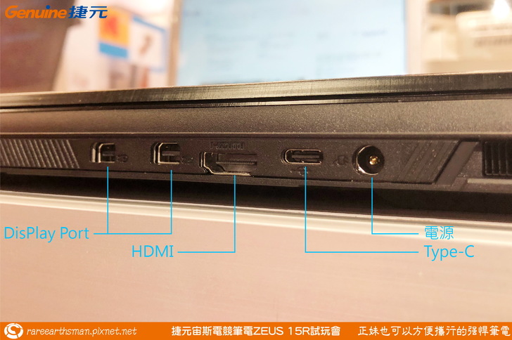 ▲這是筆電後端的I/O孔,因為現在筆電要求要越來越輕薄,而這裡一般都是筆電最厚的位置,所以有越來越多具有高度的I/O孔放置在後端,另外一個原因是這些連接埠都是屬於不常插拔的屬性,例如影像輸出插上就插上了,除非需要移動不然就基本不會動它,而且這些影音的Cable插頭都比大的,將位置放在後面也比較美觀一點;連接埠從右至左分別是電源孔、Type-C、HDMI及兩顆DisPlay Port(DP)。