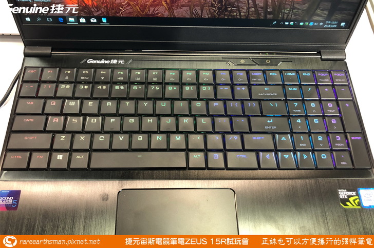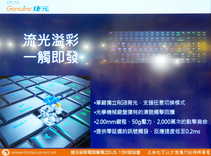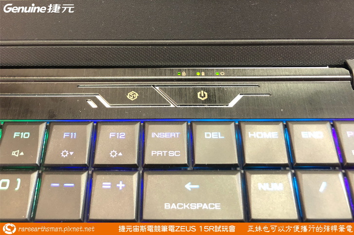 ▲ZEUS 15R配置了一個101鍵的鍵盤,按鍵設計採用機械式設計,就是鍵帽下方配置了一顆Switch,優點是按下按鍵之後的回饋更為直接與迅速,0.2ms零延遲的發出訊號,並給予清脆敲擊聲的回饋,而且同時也配置了RGB三色的LED背光,顯示顏色可以在電腦中設定,在陰暗處使用發出的七彩炫光,打Game更有感,再加上鍵帽外的雷射雕刻鍵盤符號,真的是越暗越清楚;而以上的Switch與RGB背光是每顆暗鍵都設置,也就是說這101顆按鍵同時都有這兩項零件,老實說爽度很大,就算沒在玩,在旁邊看著這片五光十色的鍵盤就很酷了,在聽到它輕脆的敲擊聲更為銷魂。