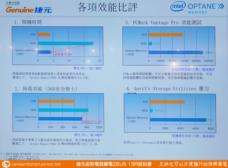▲ZEUS 15R使用的Optane Memory HDD跟SDD及HDD在眾多測試的比較。