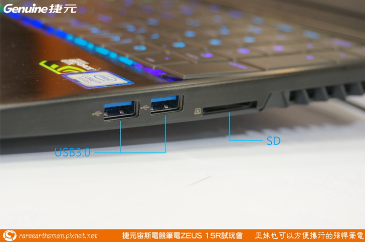 ▲ZEUS 15R的右側有兩顆USB3.0與一個SD卡槽;這裡有點比較奇怪的是,筆電左側及右側的USB孔印刷上都是3.0的Logo,可是右側內部塑膠用的顏色是藍色,左側的卻是黑色,難道是特殊的色彩設計嗎?