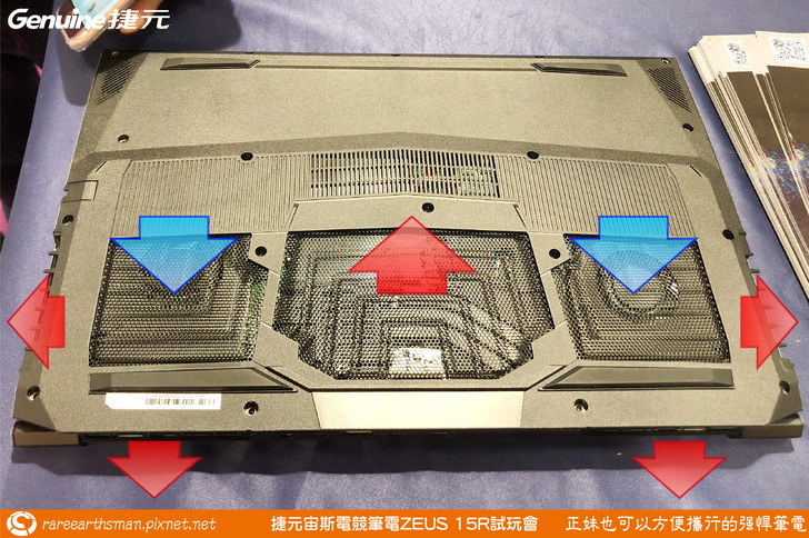 ZEUS 15R的散熱設計原理是在熱源上貼上散熱片,外面加上使用"象變化"式的導管,同時配置了左右兩顆54mm的高速離心扇,54mm在筆電上算是少見,畢竟它的尺寸滿大的,以錙銖必較的筆電來說,為何ㄧ定要放上兩顆這麼大的尺寸風扇呢?最主要的原因就是散熱,風扇尺寸大,進風量就多,加上它的旋轉速度更快,又是正面及背面同時進氣,超大的進風量可以很容易的帶進大量的冷空氣進入機殼內部,同時配上單顆兩出風口,兩顆風扇就有4個出風孔,出風孔大就有更多的熱空氣被往外帶出;更何況在機殼下方,也就是D面的部分,設計了很大的鐵網來做空氣的流動,這點在一般筆電上是少見的,但是15R尚設計了很大面積的鐵網,鐵網的開孔率很高,自然冷空氣容易進,熱空氣容易出,整個散熱的循環就更棒,CPU與顯示卡全速運轉什的高溫就很容易被帶出去。