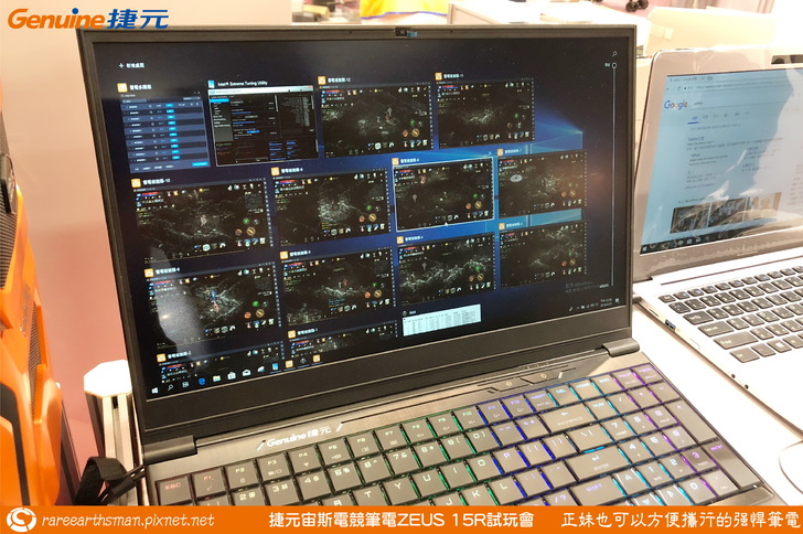 ▲現場也展示了多視窗的遊戲畫面,透過模擬器同時讓11個天堂M的遊戲視窗同時在ZEUS 15R上面跑,動作流暢不卡卡,據現場工作人員說,他們有同時最多使用16個天堂M視窗過,可見這台筆電的效能有多好;當然這麼多視窗在跑,這台雖然有15.6吋的螢幕,可是每個視窗顯示的範圍還是有點小,也許可以多工延伸1-2個螢幕來增加顯示面積,但如果要全部讓16個視窗都各自獨立一個螢幕的話,就會需要外接一個訊號轉接器才可能辦到了。