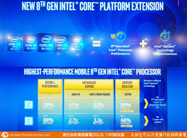 ▲ZEUS 15R的核心就是Intel最新的第8代處理器,圖中列表的是第8代的CORE i9比對第7代的CORE i7,另一組是第8代的CORE i7對上3年前的系統,至於為何要這樣比對,想必廠商有先計畫過使用者為何要更換成第8代的晶片,原因可能是因為換機潮出來了,而2-3年前的就系統最有可能換裝,所以就拿來做比對,效能是精進許多。